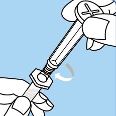 注射用水入シリンジのゴム栓にプランジャーを時計回りに回しながら接続します。